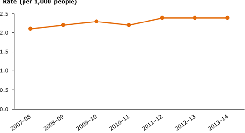 Potentially preventable hospitable separations due to dental conditions for people aged 65 and over, from 2007-08 to 2013-14;